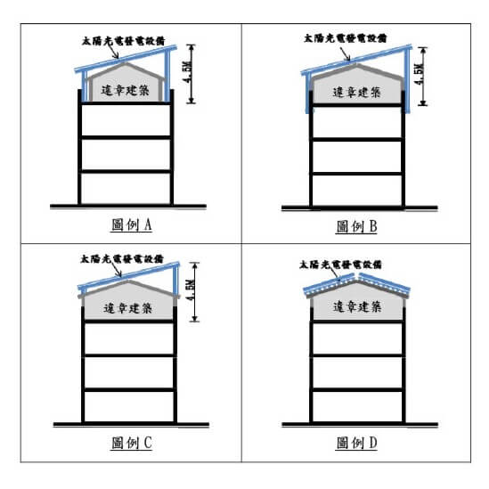 上述四種違建型態可以設置屋頂光電,在法規上是內政部《設置再生能源設施免請領雜項執照標準》中,第5條第5項的規定,但實際上還是必須同時衡量屋頂強度、支架穩固性、設置角度等評估,這些會由系統商與結構技師來考量。此外,雖然中央有放寬標準,但違建是不是能夠設置光電,最主要還是由各縣市政府的建管單位,在考量是否整棟違建、兩層樓以上等標準,以及後續可能的消防安全等因素之下,來認定是否能夠設置。因此,違建是否設置屋頂光電的標準,每個縣市都不一樣。