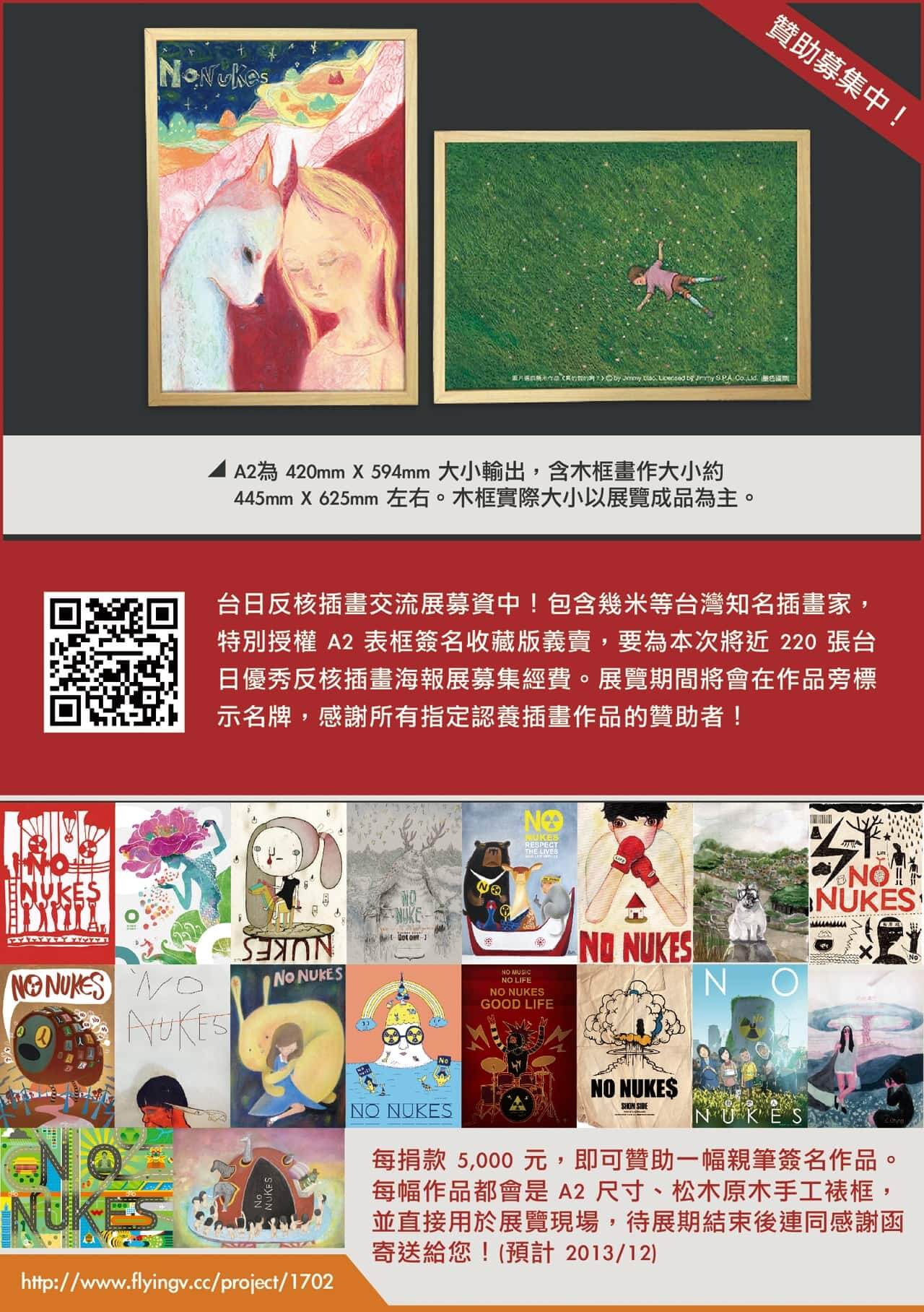 為宣傳反核理念及教育推廣,綠色公民行動聯盟集結各界藝文資源,於11月22日起於台北松菸舉辦為期10天的〈2013 零核時代:不核作運動!〉的大型複合式展覽。其中〈台日反核插畫聯展〉將展出220幅反核插畫,為展覽募資及巡迴展出、推廣零核理念,著名繪本畫家幾米與其他19位插畫家,大方授權親筆簽名畫作,邀集各界認購插畫家們的親筆簽名A2裱框畫。