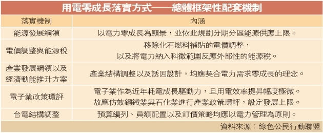 因此去年度於全國氣候變遷會議中,公民團體指出:「面對氣候變遷的溫室氣體減量挑戰以及核災風險威脅,應以『電力需求零成長』為能源政策(能源發展綱領政策環評)的規劃核心,同時達成非核家園以及低碳社會。」因此要求政府應學習廢棄物政策上的「從一縣市一焚化爐到零廢棄」此般政策軸線翻轉的經驗,揚棄以往於能源政策規劃之時,僅將「產業結構調整、能源效率提升」等節能政策,視為雞肋或是不切實際理想的觀念,重新以達到能源總量管制為前提,盤整所有政策,如重新訂定永續能源政策綱領中能源效率每年提昇2%之政策目標。而綠色公民行動聯盟,亦於後續諮詢會議上,提出應採行以下五大落實機制(見表),達成以2025年時,用電量維持至2010年之水準此用電需求零成長的目標。