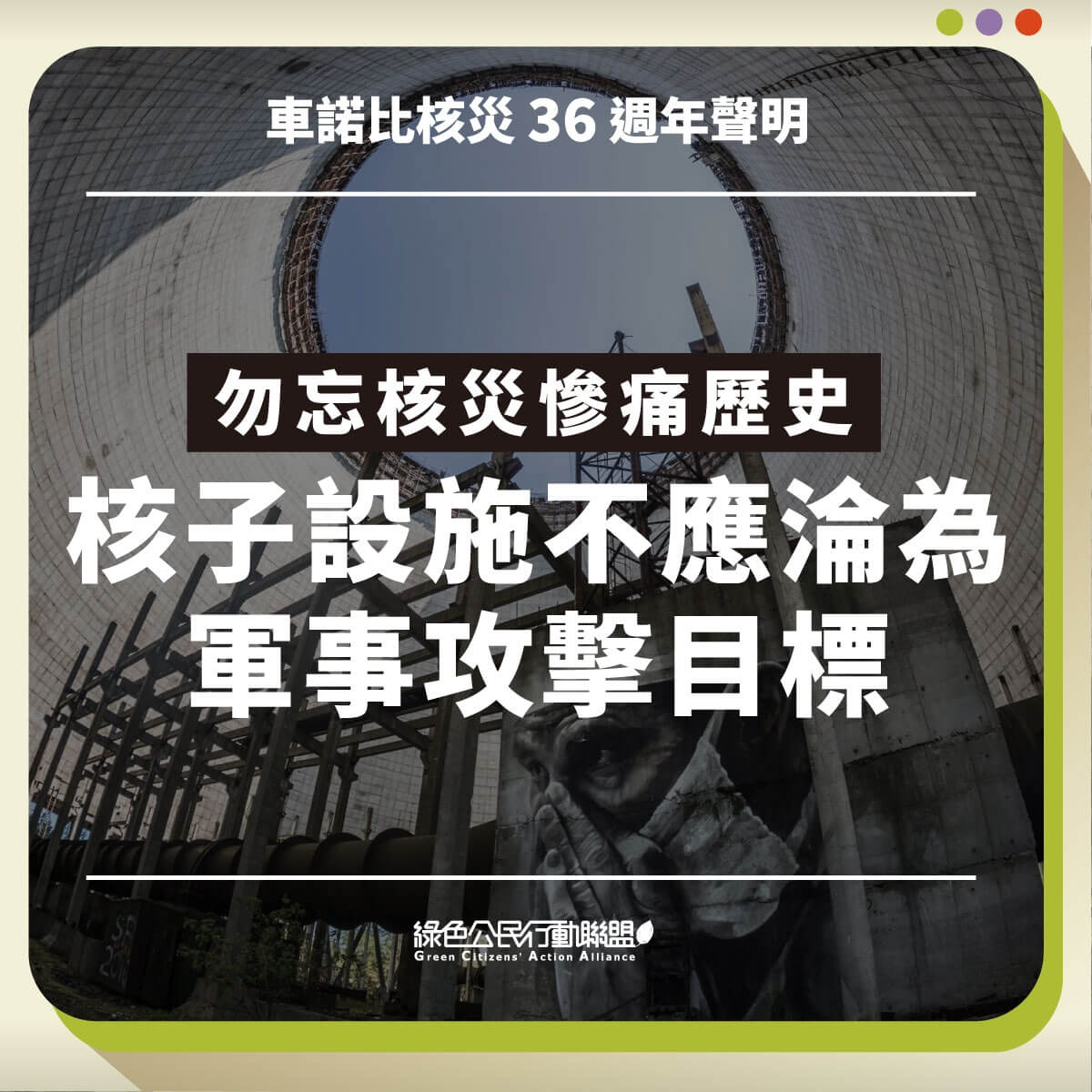 在車諾比核災36週年之際,現今的「核子設施在戰爭中成為軍事攻擊目標」此一事實不僅提醒世人,車諾比核災從未結束,美蘇核武強權只會故技重施,更警示世人認清,核子設施一如平民,在地緣政治衝突中無法倖免於難的事實。最終的困境與災難並不僅只是核武強國的殺戮與破壞,而是對此一事實無動於衷,甚至刻意隱瞞。36年前的車諾比核災給世人留下的災難至今仍在,不該再讓歷史重演,且更不該因敵對國家、團體的戰爭與武裝衝突導致災難再度發生。本會呼籲,所有擁有核武的國家皆應立即停止戰爭,不應以核子武器、核能設施為要脅手段,此外,更不應該使用任何核子武器。我們責無旁貸應讓這一代、下一代都有享受生命、免於核災、核戰恐懼的權利。